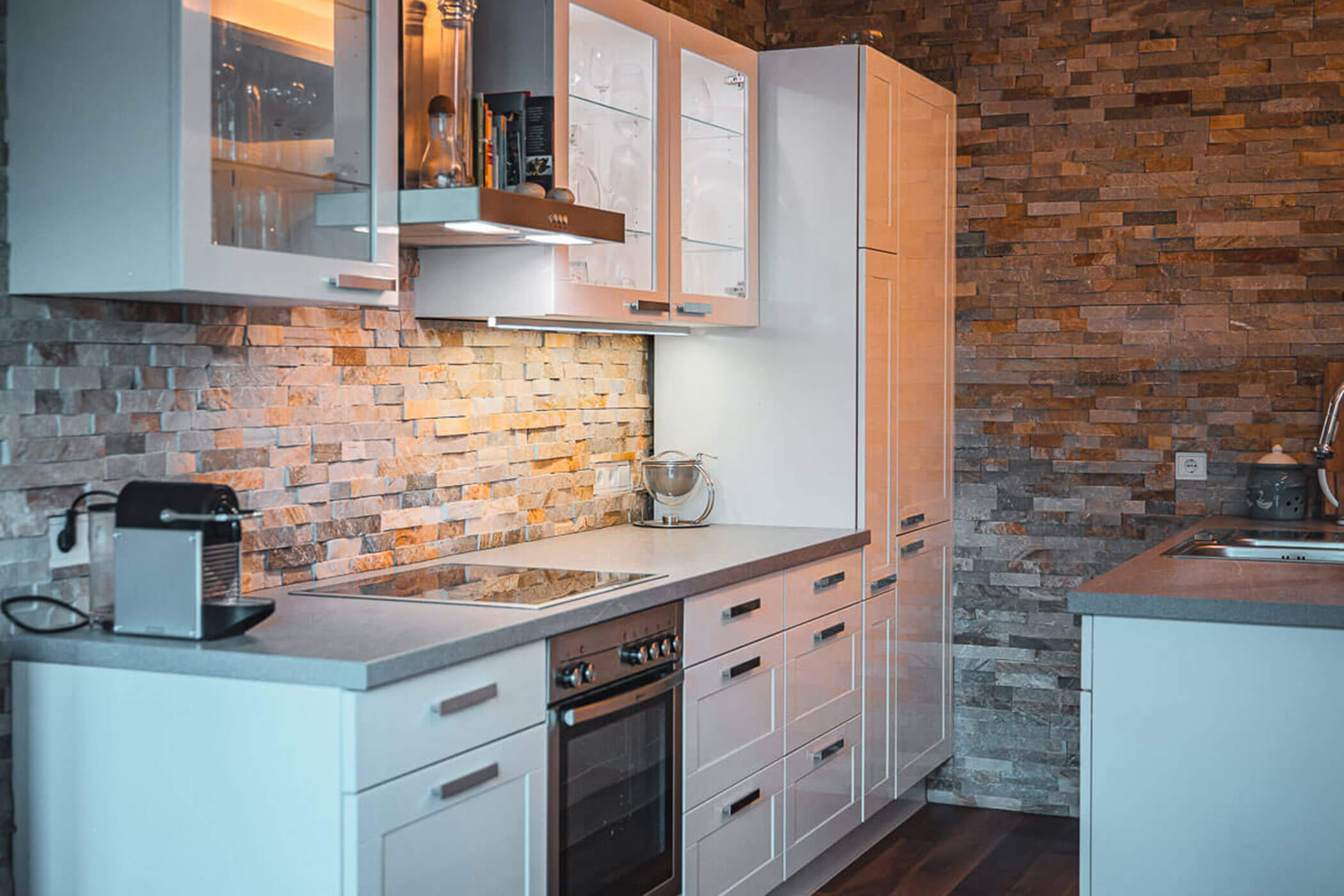 1 Küche komplett eingerichtet (großer Kühlschrank mit Gefrierfach, Geschirrspüler, Abzugshaube, Keramikkochplatte mit 4 Kochstellen, Mikrowelle, Toaster, Kaffeemaschine, Wasserkocher, Teller, Gläser, Töpfe, Besteck usw.)