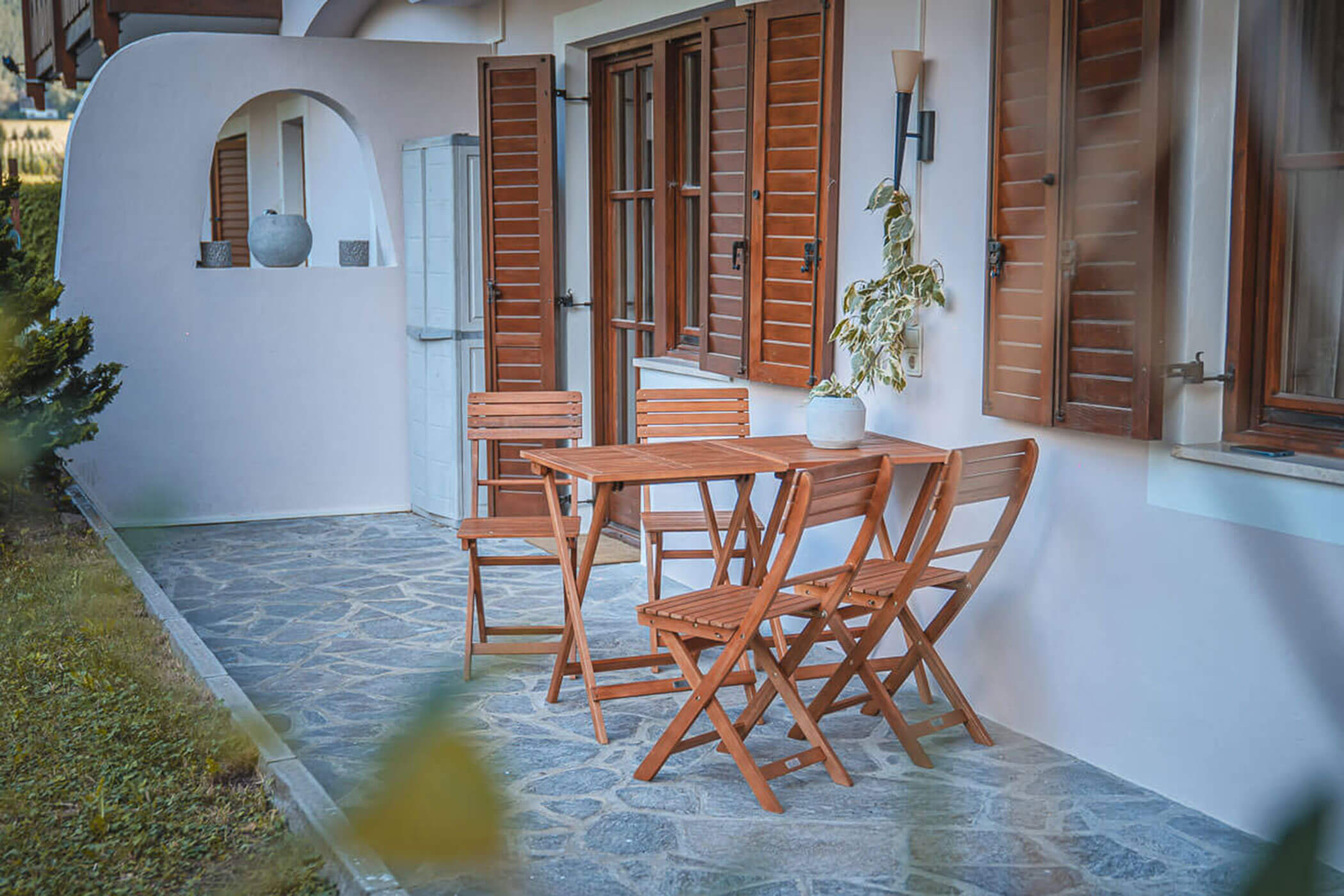 Terrasse mit Tisch und Stühlen sowie Liegestühlen