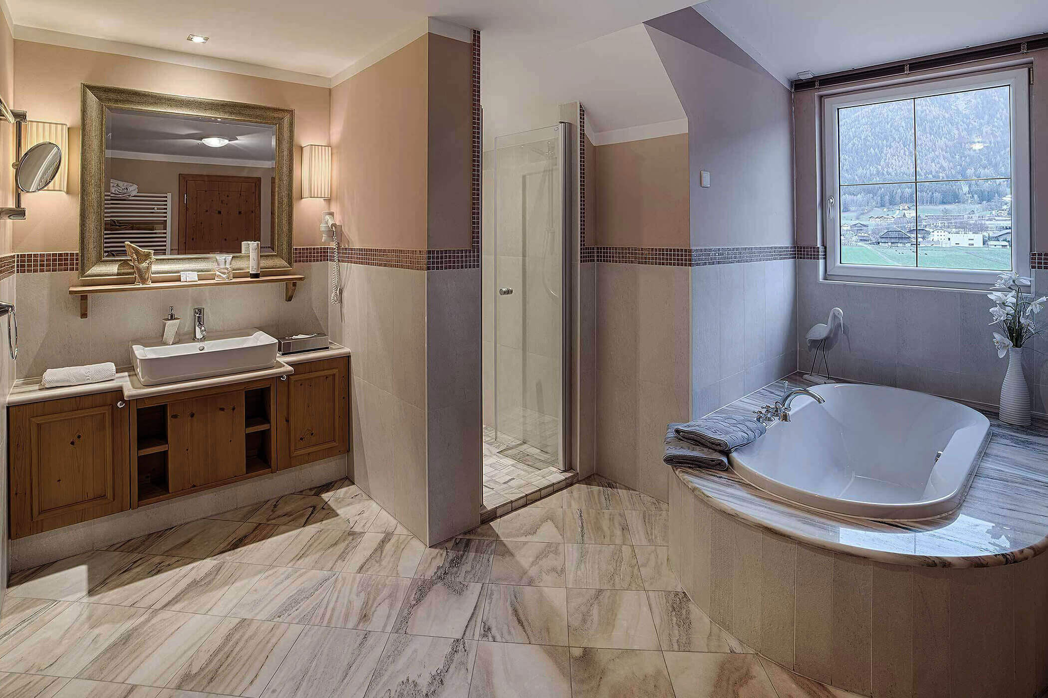 Badezimmer mit Badewanne und Dusche, WC, Bidet, Haartrockner